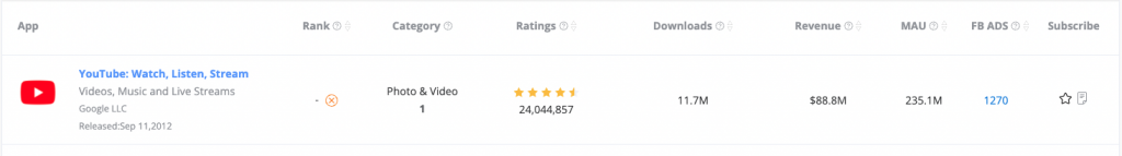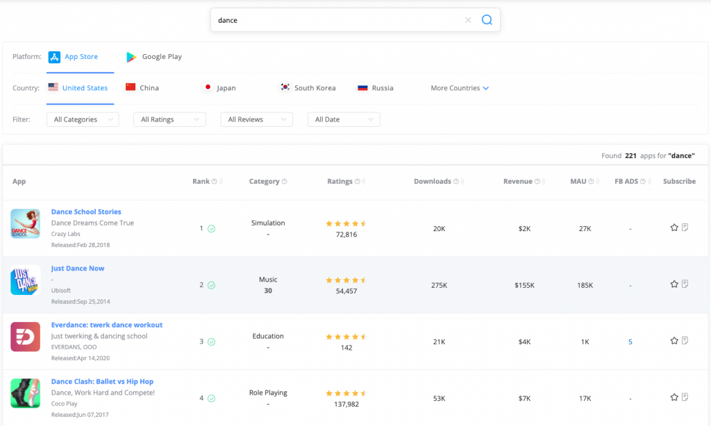 The data displayed in the search results consists of App basic information and app core data. The former can be found and summarized in the store, including title, subtitle, developer, release time, classification, classification ranking, ratings and score. The latter is the core data of ASOTools, including download volume and revenue estimation, MAU estimation, and recent Facebook advertising statistics of the App. The data above only shows the value of last month in the search results. If you need more historical data, you need to subscribe to the app.