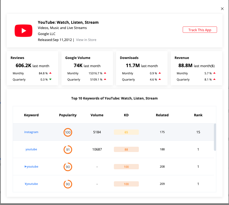 Moreover, by clicking each application, you can activate the app detail pop-up window. The data in the pop-up window includes the number of comments, Google search volume, the recent ring ratio of downloaded revenue data. The top ten keywords of the current application in the current country and store are listed at the bottom. The keywords here echo the functions of the keyword page. Users can get an intuitive understanding through the current top ten keywords. If you want to further understand the details of keywords, click any keyword to jump to the keyword analysis page.