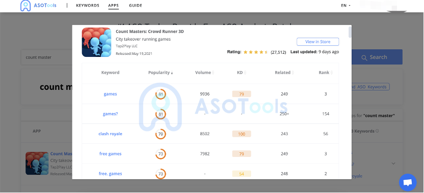 Here is another example. As a famous game on the hot list, Count Masters prefers to lay out keywords on categories like “game” and “free game” to build their strength. As a result, the strategy of keywords could be quite different, it is so called “All roads lead to Rome”,as long as you find the road fit your app.