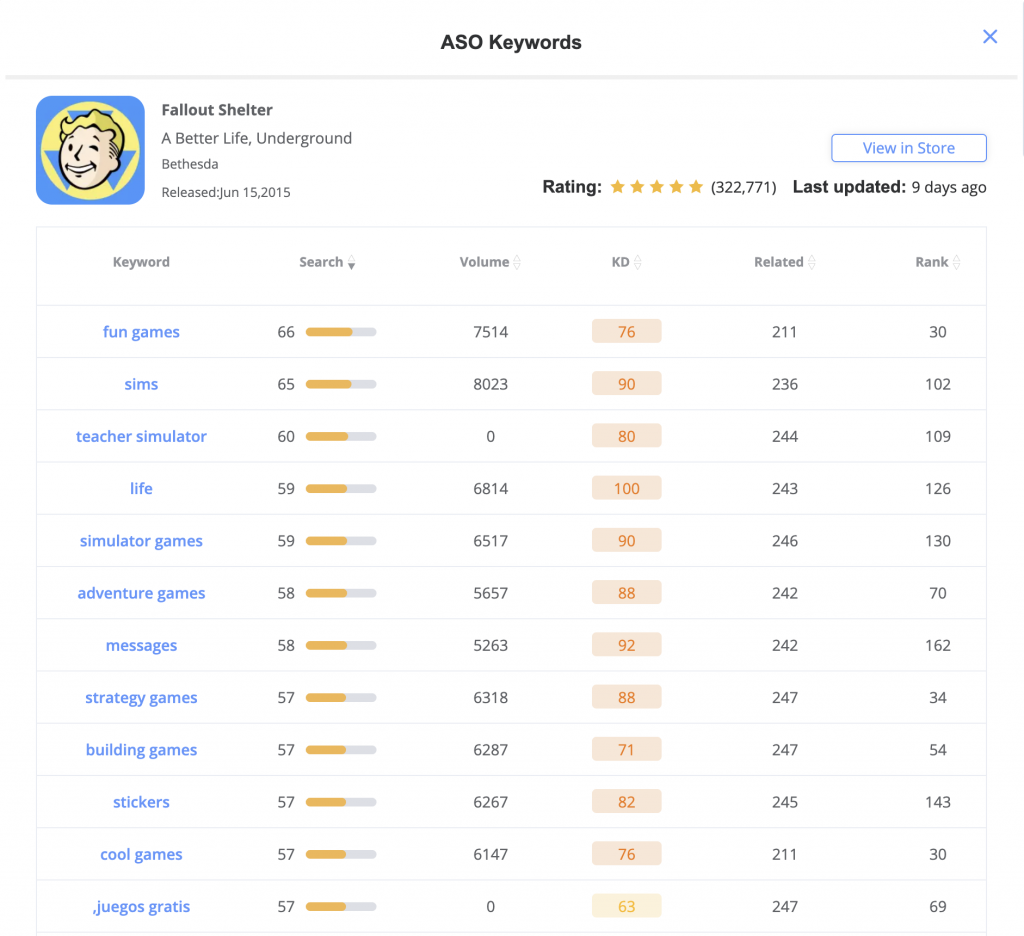 And Fallout Shelter are part of the same series, but this one uses a more general ASO technique on keyword ASO, and we can look at its number one keyword: