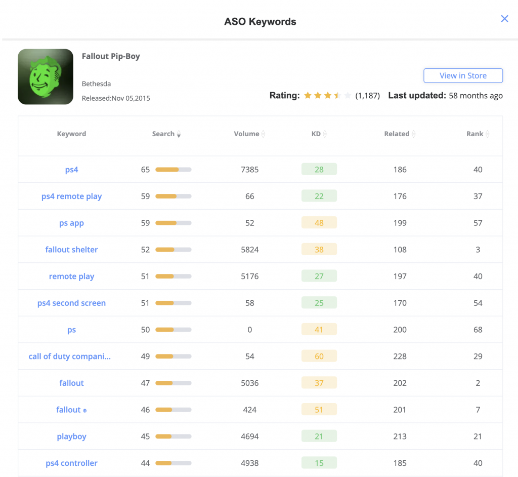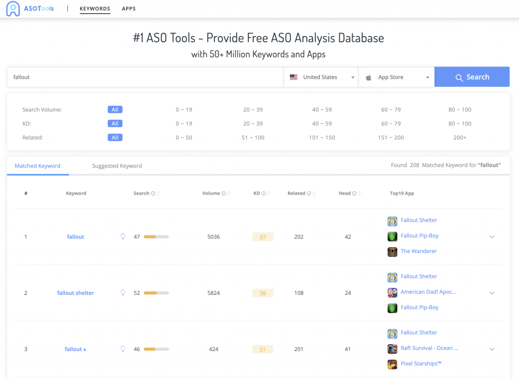 In 2020- 2021, when the number of downloads is soaring, it's easy to miss this opportunity if you don't take advantage of keyword rankings for targeted optimization. According to ASOTools.io, we can look first at top5 of the top rankings for the best fallout game keywords at the moment: