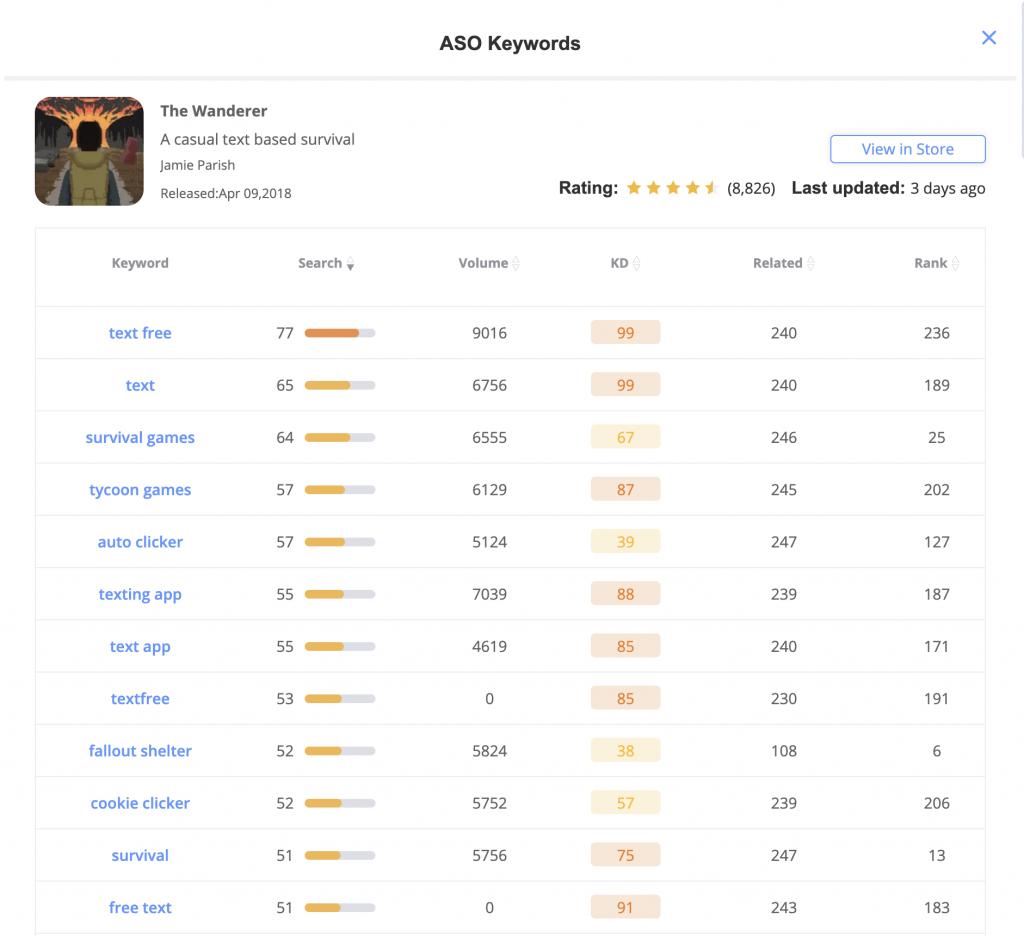 According to data, the keywords for fallout games are generally not too difficult and have a lot of traffic, which is actually an easy keyword to optimize for the App Store. The relevant keywords are: