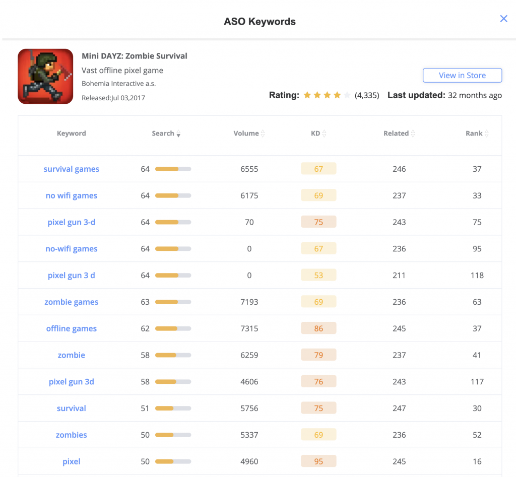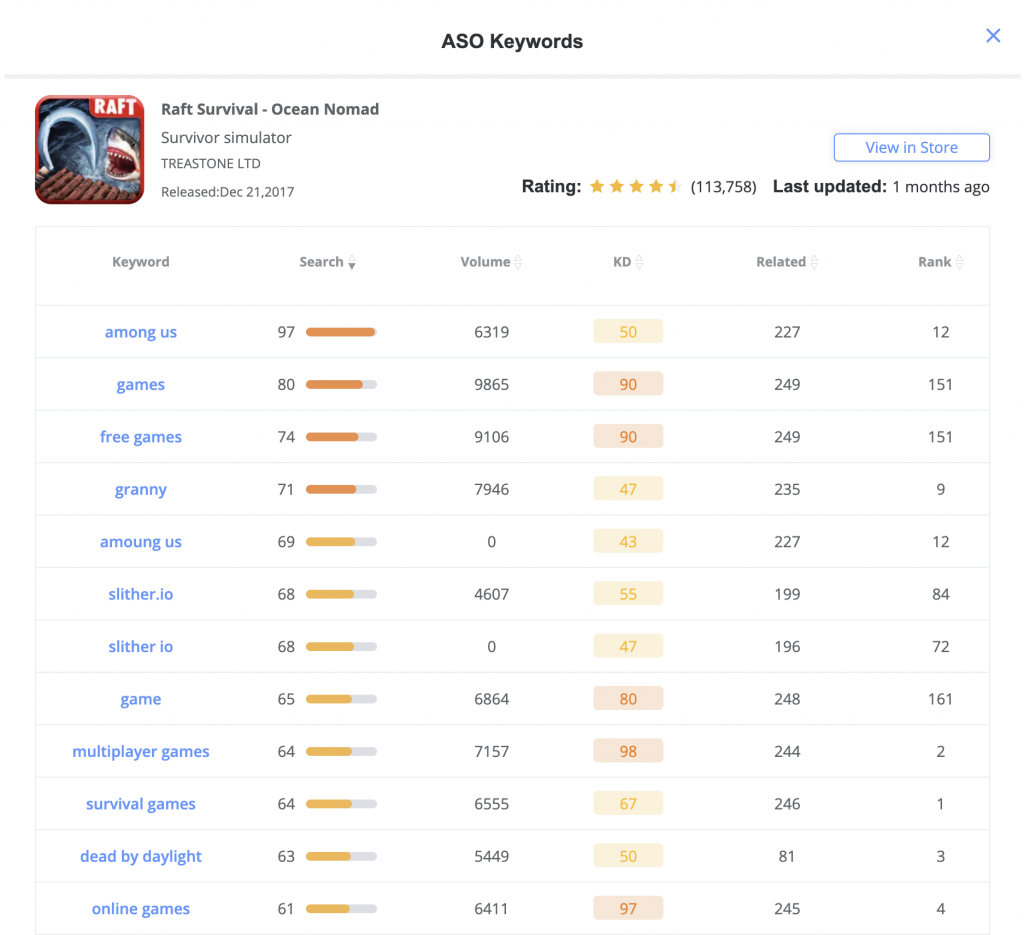 This is a relatively well-known survival game, the existing traffic base is very large, in the keyword ASO, in fact, there is not much content. Most of its keywords are not ranked very high: