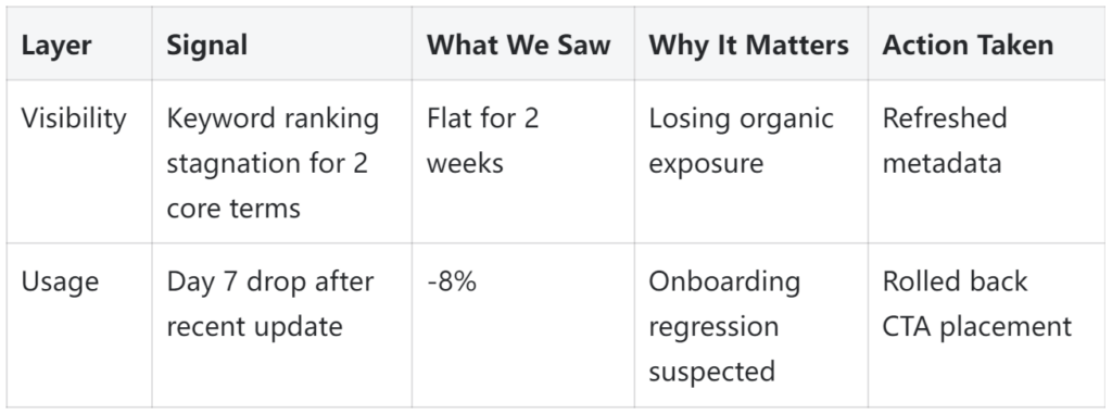 • Leading: Ranking movement, trial-to-paid ratio, funnel friction. They show what’s about to change.
