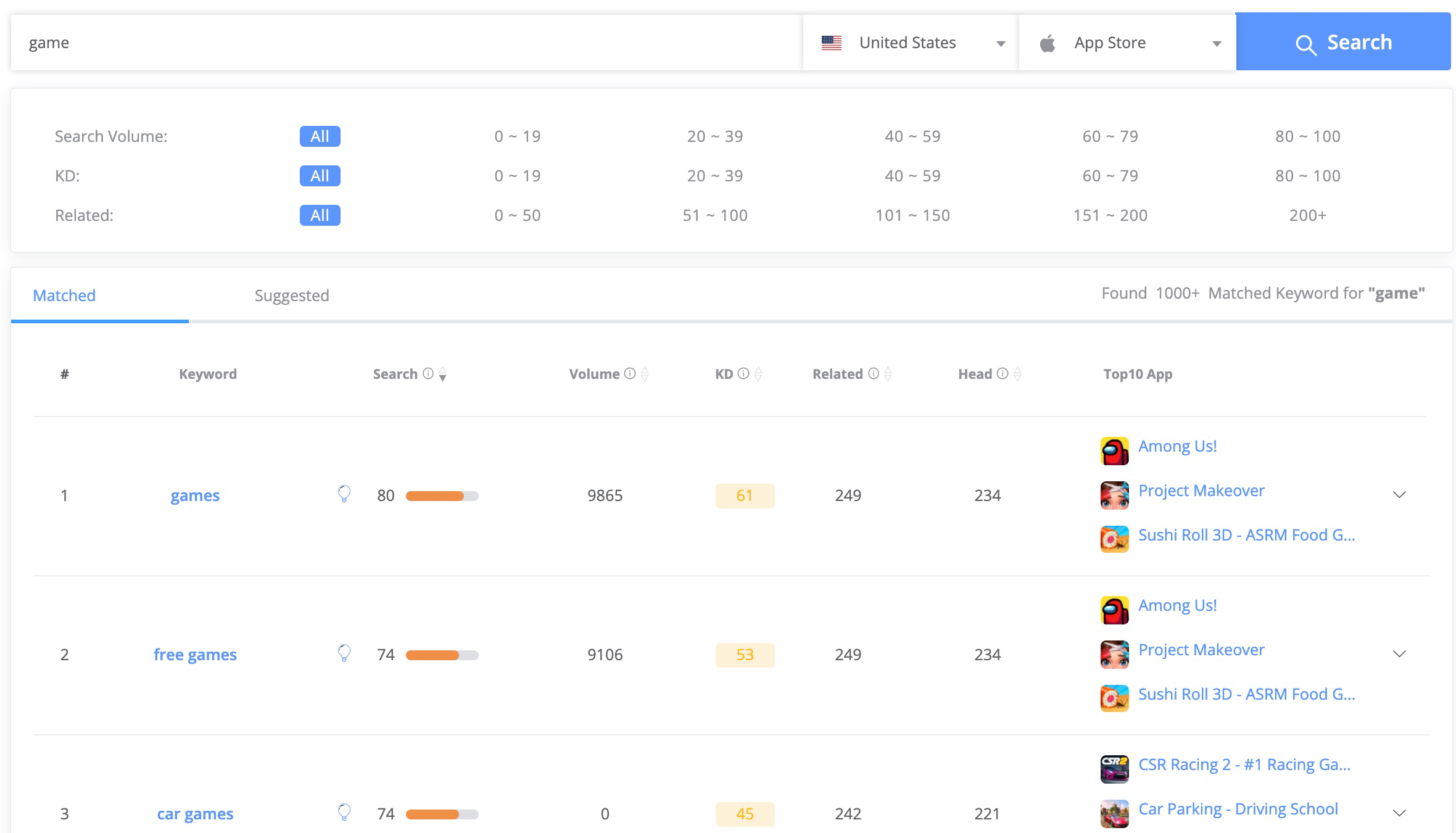 For example, I also need to expand other long-tail words related to the keyword “game”, which will search for other keywords related to this keyword, popularity, data such as related apps and numbers are listed to facilitate keyword selection.