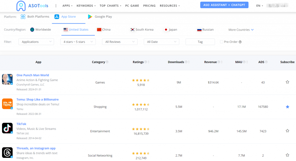 • App Marketing Tools: Discover new trends and opportunities by analyzing top charts and store analytics of the App Store and Google Play.
